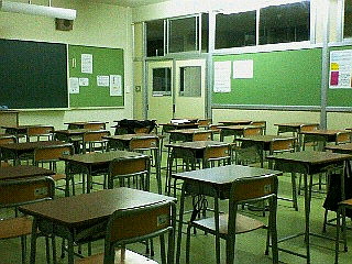 (↓夜6時を過ぎた教室の図。ドア近くの荷物があるのが俺の席。)