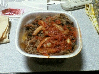 ・夕食で、初めてすきやの牛丼を食べました。キムチのヤツ。