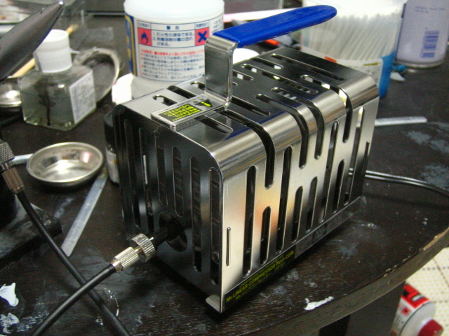 まず一旦ボークスで値段と種類を見て、それから大阪駅前のヨドバシカメラまで行って価格比較。その結果、ヨドバシカメラでクレオス社のリニアコンプレッサー プチコンに決定。なんてったってお安い。