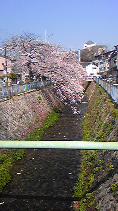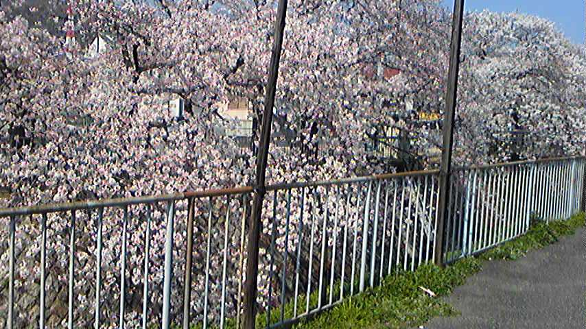 それから図書館に行ってみたのですが休館の様子。それならそれで、とぶらついた先でなかなか見事な花見スポットを発見。小さな川沿いの道に桜がずらっと咲いていました。