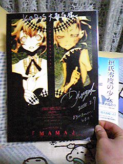 先日、行きつけの書店で譲ってもらった『MAMA』のポップ。電撃文庫恒例のポストカードと同じデザインでサイズが大きいやつをラミネートしてあるんですが、通常版のポストカードが手に入らなかった都合上、まぁかなり嬉しいですね。しかも作者の直筆サイン付きという!